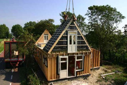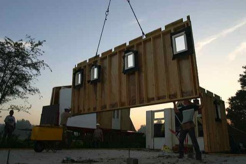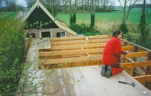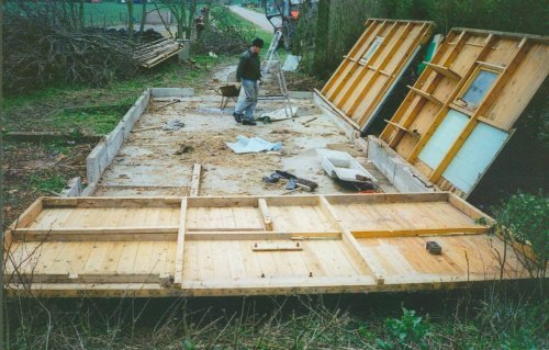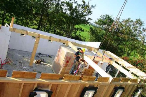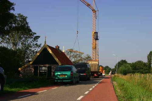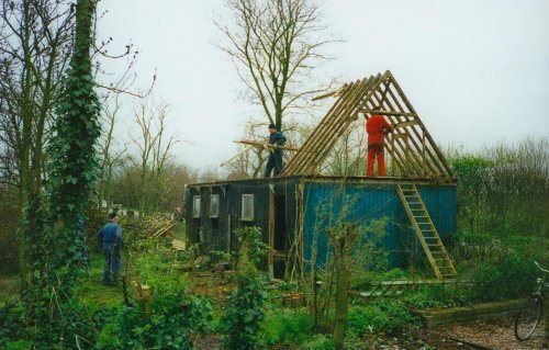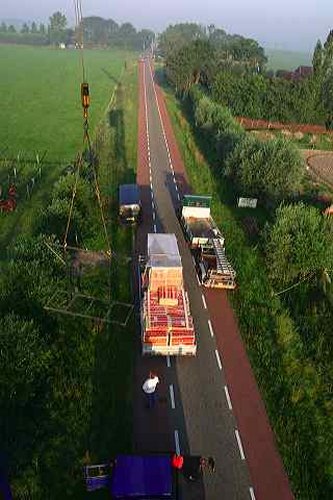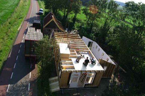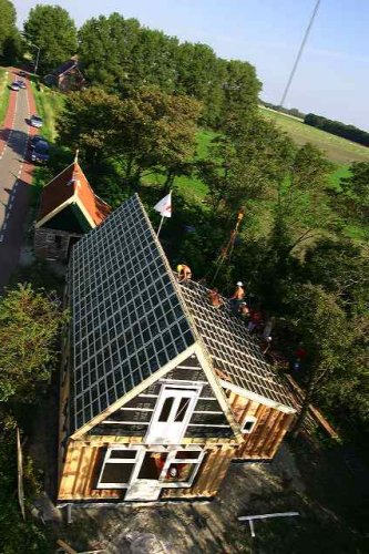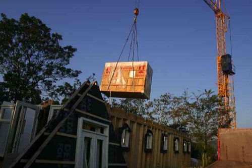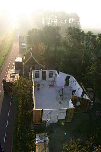 ![]() Second story beams being positioned (with the huge ship’s crate below) |