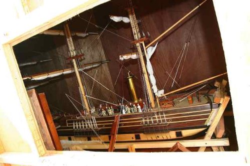 ![]() “Massachusetts of Boston” replica (in crate) being placed in building before roof goes on (ship is 9 ft. by 6 ft. and too large to fit through entryways) |