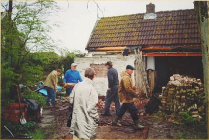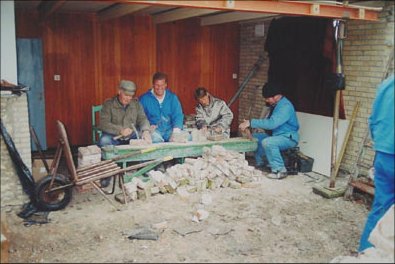 ![]() Chipping wall bricks for reuse. The woman, 2nd on the right, is our chairman, Maartje van Hesteren. |