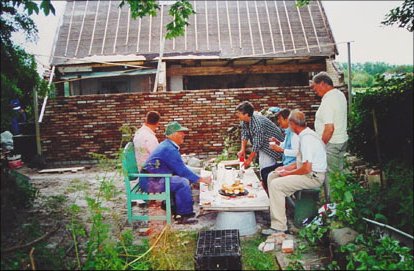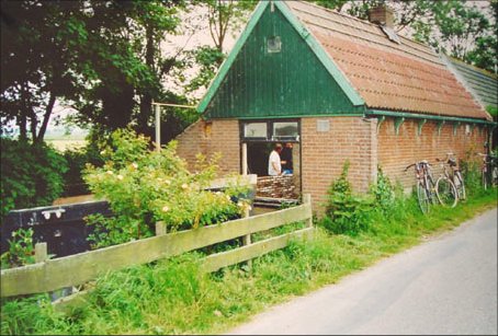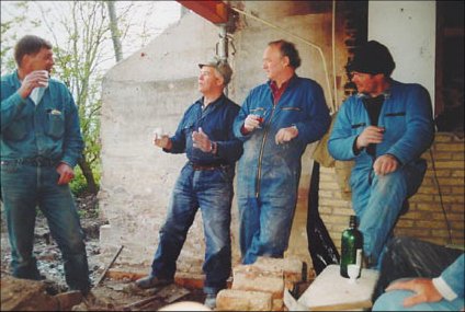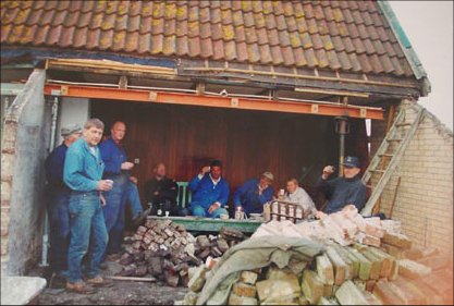 Coffee break. Standing on the right, the former mayor of our region who has a warm interest in history and the cooperative sense of the Eenigenburgers. Sitting on the right, Douwe, Maartje, and the canteen duty lady, Tiny Borst. Left: Nick Borst and Dirk. |