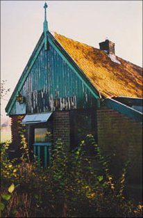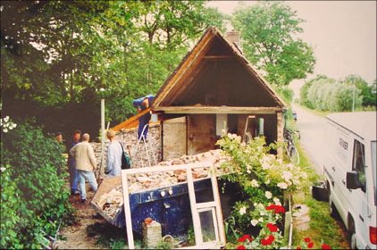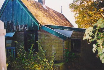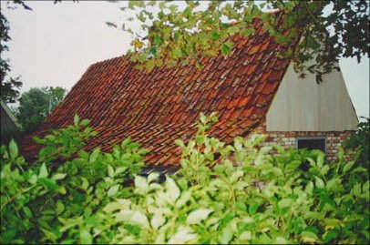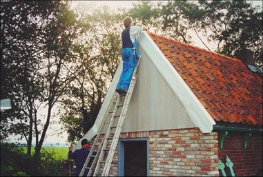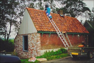 ![]() Old roof tiles are removed. They are concrete. Klaas had collected good second hand roof tiles to replace the old. The west gable was renovated with red cedar wood. |
